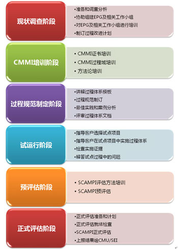 本文由瑞和信誠(chéng)為您搜集整理,希望對(duì)您企業(yè)的發(fā)展有所幫助。如果您想了解更多有關(guān)于CMMI認(rèn)證,請(qǐng)聯(lián)系瑞和信誠(chéng)資深專業(yè)咨詢師:010-64439282。什么是CMMI認(rèn)證? CMMI的等級(jí) 2、已管理級(jí) 建立了基本的項(xiàng)目管理過(guò)程來(lái)跟蹤費(fèi)用、進(jìn)度和功能特性。制定了必要的過(guò)程紀(jì)律,能重復(fù)早先類似應(yīng)用項(xiàng)目取得的成功經(jīng)驗(yàn)。 3、已定義級(jí) 已將軟件管理和工程兩方面的過(guò)程文檔化、標(biāo)準(zhǔn)化,并綜合成該組織的標(biāo)準(zhǔn)軟件過(guò)程。所有項(xiàng)目均使用經(jīng)批準(zhǔn)、剪裁的標(biāo)準(zhǔn)軟件過(guò)程來(lái)開發(fā)和維護(hù)軟件,軟件產(chǎn)品的生產(chǎn)在整個(gè)軟件過(guò)程是可見的。 4、量化管理級(jí) 分析對(duì)軟件過(guò)程和產(chǎn)品質(zhì)量的詳細(xì)度量數(shù)據(jù),對(duì)軟件過(guò)程和產(chǎn)品都有定量的理解與控制。管理有一個(gè)作出結(jié)論的客觀依據(jù),管理能夠在定量的范圍內(nèi)預(yù)測(cè)性能。 5、優(yōu)化管理級(jí) 過(guò)程的量化反饋和先進(jìn)的新思想、新技術(shù)促使過(guò)程持續(xù)不斷改進(jìn)。每個(gè)等級(jí)都被分解為過(guò)程域,特殊目標(biāo)和特殊實(shí)踐,通用目標(biāo)、通用實(shí)踐和共同特性:每個(gè)等級(jí)都有幾個(gè)過(guò)程區(qū)域組成,這幾個(gè)過(guò)程域共同形成一種軟件過(guò)程能力。每個(gè)過(guò)程域,都有一些特殊目標(biāo)和通用目標(biāo),通過(guò)相應(yīng)的特殊實(shí)踐和通用實(shí)踐來(lái)實(shí)現(xiàn)這些目標(biāo)。當(dāng)一個(gè)過(guò)程域的所有特殊實(shí)踐和通用實(shí)踐都按要求得到實(shí)施,就能實(shí)現(xiàn)該過(guò)程域的目標(biāo)。 為什么企業(yè)需要CMMI認(rèn)證?1、作為一個(gè)參照模型與公司現(xiàn)有的模型比較,了解兩者的差距; 2、規(guī)范軟件開發(fā)過(guò)程及其管理; 3、幫助企業(yè)進(jìn)行內(nèi)部的過(guò)程改進(jìn),這是CMMI最有特色的地方。 軟件過(guò)程的改進(jìn)和軟件過(guò)程能力的提高可以提高產(chǎn)品質(zhì)量、控制成本、提高勞動(dòng)生產(chǎn)率; 4、增加企業(yè)的國(guó)際競(jìng)爭(zhēng)力; 5、可以降低軟件開發(fā)風(fēng)險(xiǎn)。 申請(qǐng)CMMI企業(yè)需要準(zhǔn)備哪些手續(xù)呢??CMMI認(rèn)證對(duì)于企業(yè)沒(méi)有硬性的要求,只要企業(yè)有愿望獲取CMMI3級(jí)證書,任何軟件開發(fā)或軟件服務(wù)的企業(yè)都有權(quán)力去申請(qǐng)CMMI3級(jí)的認(rèn)證,但是企業(yè)要獲得SEI的認(rèn)可,獲得CMMI證書,這個(gè)過(guò)程就需要企業(yè)按要求導(dǎo)入了CMMI3的模型,建立起CMMI3的管理模型與框架,最終符合CMMI3的要求。當(dāng)然這個(gè)過(guò)程就需要咨詢公司的協(xié)助將會(huì)更順利。這個(gè)CMMI認(rèn)證不需要其它企業(yè)資質(zhì)的支持。 申請(qǐng)CMMI認(rèn)證的流程