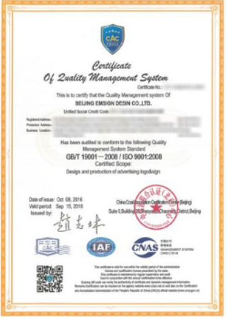 北京易美聯(lián)合標(biāo)識(shí)設(shè)計(jì)有限公司擁有一支朝氣蓬勃,技術(shù)過硬且創(chuàng)新敬業(yè)的新生代高素質(zhì)人才隊(duì)伍,依靠良好的信譽(yù)與技術(shù)優(yōu)勢(shì) ,取得了用戶的一致好評(píng),以及同行業(yè)的共同認(rèn)可。依托戰(zhàn)略國際全球領(lǐng)先的專業(yè)技術(shù)和營運(yùn)經(jīng)驗(yàn)。時(shí)刻謹(jǐn)記以誠信之心取信于社會(huì)、以誠實(shí)之為取信于市場(chǎng)、以誠懇之情取信于客戶、以誠摯之行取信于同仁,深知人才、誠信、創(chuàng)新對(duì)企業(yè)的重要性。公司堅(jiān)持以科學(xué)發(fā)展觀統(tǒng)攬全局,實(shí)施 以人才為根本、以市場(chǎng)為導(dǎo)向、以效益為核心、以創(chuàng)新為動(dòng)力、以專業(yè)樹品牌的發(fā)展戰(zhàn)略,堅(jiān)定地走快速、協(xié)調(diào)、持續(xù)、健康的發(fā)展之路。 該企業(yè)順利通過GB/T 19001-2008/ISO9001:2008認(rèn)證 該企業(yè)順利通過GB/T 24001-2004/ISO14001:2004認(rèn)證 |