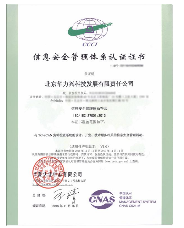 北京華力興科技發(fā)展有限責任公司(HLX),專業(yè)致力于研究、生產大型透視檢查設備。由同方 威視技術股份有限公司(NUCTECH)和清華大學核能技術設計研究院(INET)強強聯合打造的華力興,如今發(fā)展成為一家集研發(fā)、設計、制造、工程、服務于一體的具有中國自主知識產權的世界知名貨物/車輛安全檢查系統(tǒng)供貨廠商。 依托于清華核研院在輻射物理、核探測技術方面五十年的經驗,華力興以數字輻射成像技術為核心研發(fā)出的TC-SCAN貨物/車輛安全檢查系統(tǒng)、TC-SCAN工業(yè)核測控系統(tǒng)和智能綜合安全管理系統(tǒng),可根據不同用戶的需求,為客戶量身定制世界先進水平的非接觸式測量、控制、檢查裝備和綜合安全管理解決方案。 同方威視技術股份有限公司攜北京華力興科技發(fā)展有限責任公司在集裝箱檢查系統(tǒng)領域的國際市場具有強大競爭力,占據65%的市場份額;同時,北京華力興科技發(fā)展有限責任公司結合自身產品的技術特點和安檢領域的行業(yè)經驗在更多領域和行業(yè)開發(fā)生產出新的產品,如底盤檢查系統(tǒng)、手持爆炸物檢測系統(tǒng)、智能安防監(jiān)控系統(tǒng)等多種小型安檢設備,使公司產品種類更加豐富涉及領域更全面,為更多領域客戶的綜合安全管理提供前沿的技術和優(yōu)質的服務。 企業(yè)順利通過信息安全管理體系ISO/IEC27001:2013 認證 |
